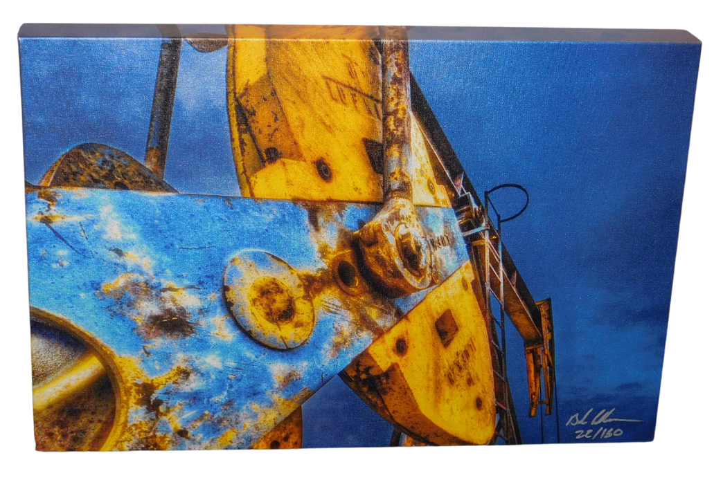 Oilfield art created by Bob Callender, a local Midland artist, who takes the photos, color edits, and puts the print on custom stretched canvas.