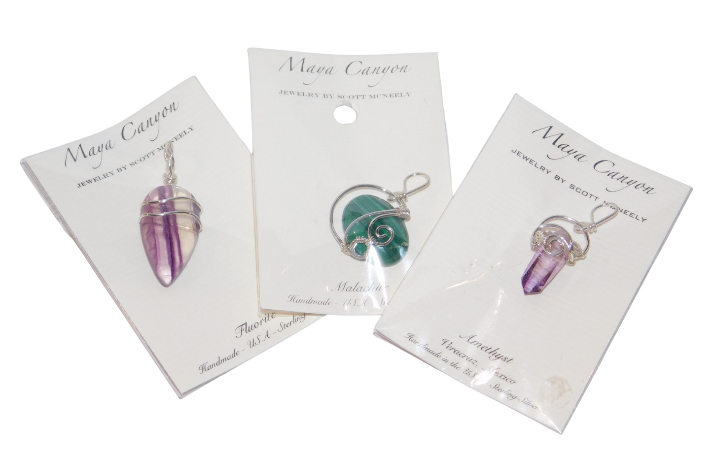 Bring home a beautiful Maya Canyon Pendant, the perfect addition to any jewelry collection. Between Fluorite, Malachite and Amethyst, why not choose them all and add a pop of color to any outfit?